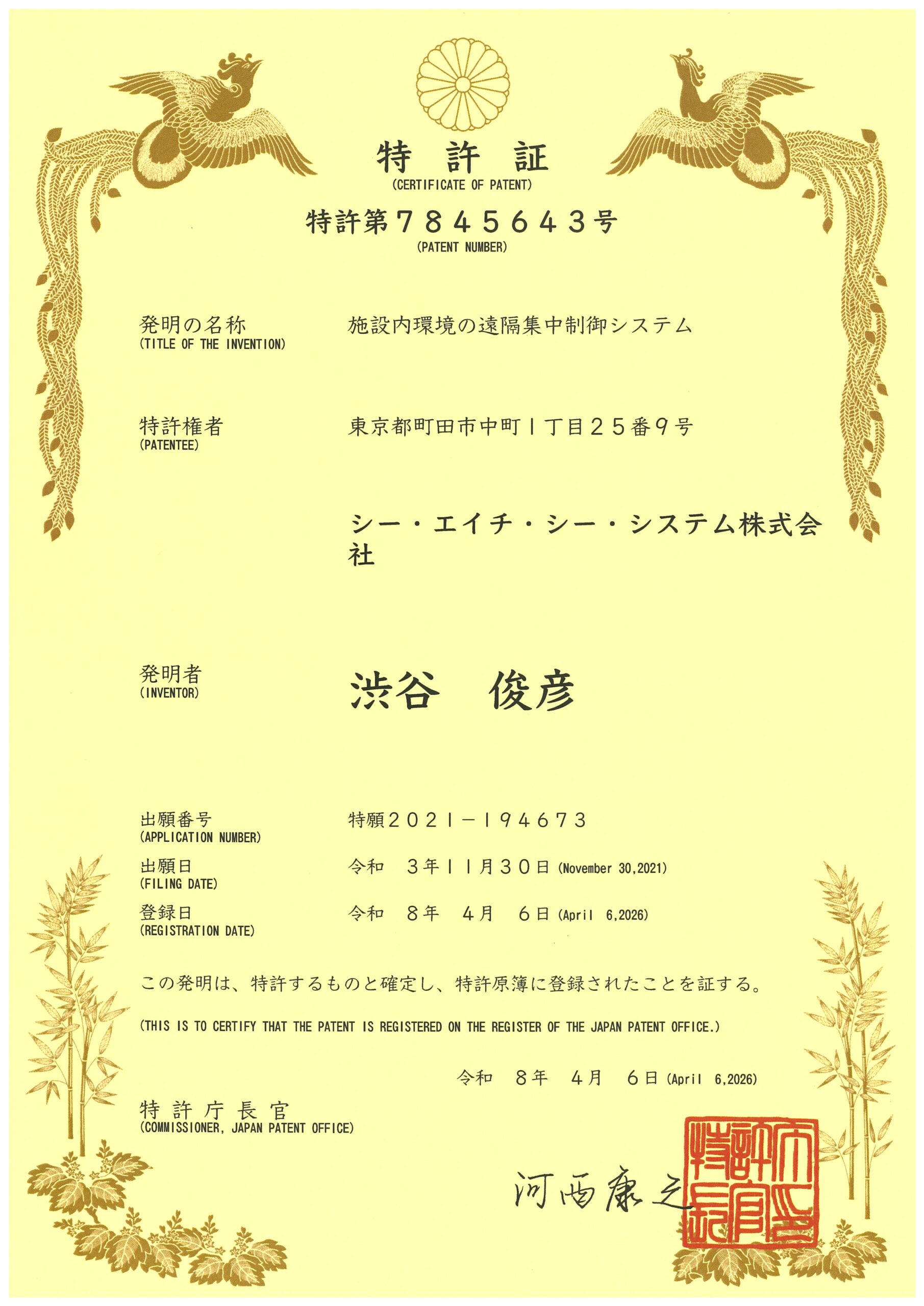 シー・エイチ・シー・システム株式会社は、「施設内環境の遠隔集中制御システム」に関する技術について、特許を取得いたしました。本発明は、空調・換気などの設備を遠隔から一元管理・制御することで、施設運用の効率化および省エネルギー化を実現するものです。